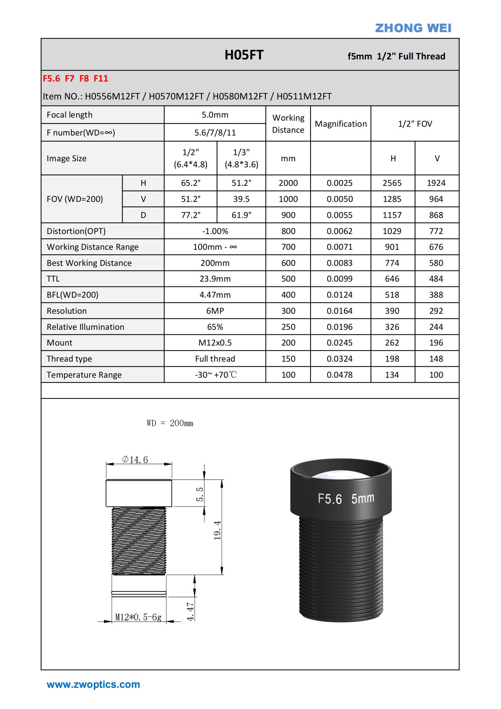 | H0556M12FT | 5 | 5.6 | 1/2" | -1% | 100 - ∞ | M12x0.5 | Full Thread | 6MP | NO |