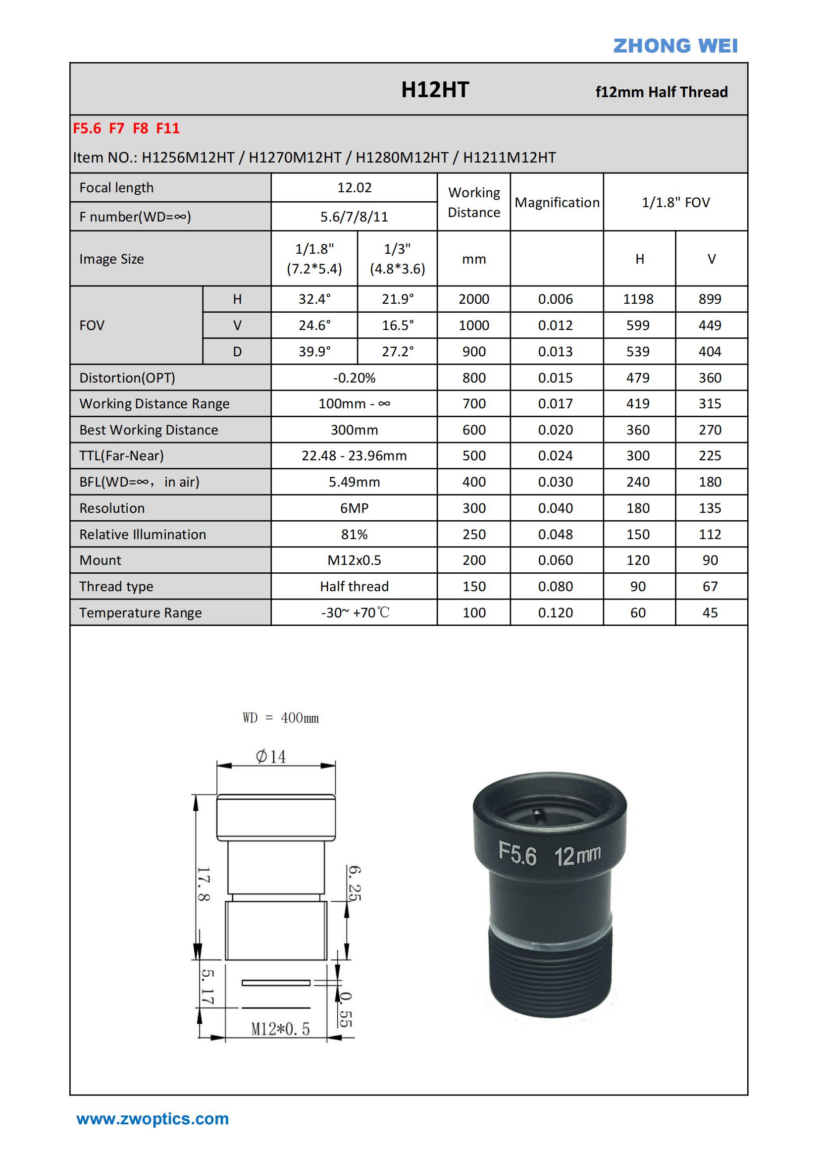 | H1270M12HT-VIS | 12.02 | 7 | 1/1.8" | -0.2% | 100 - ∞ | M12x0.5 | Half Thread | 6MP | YES |